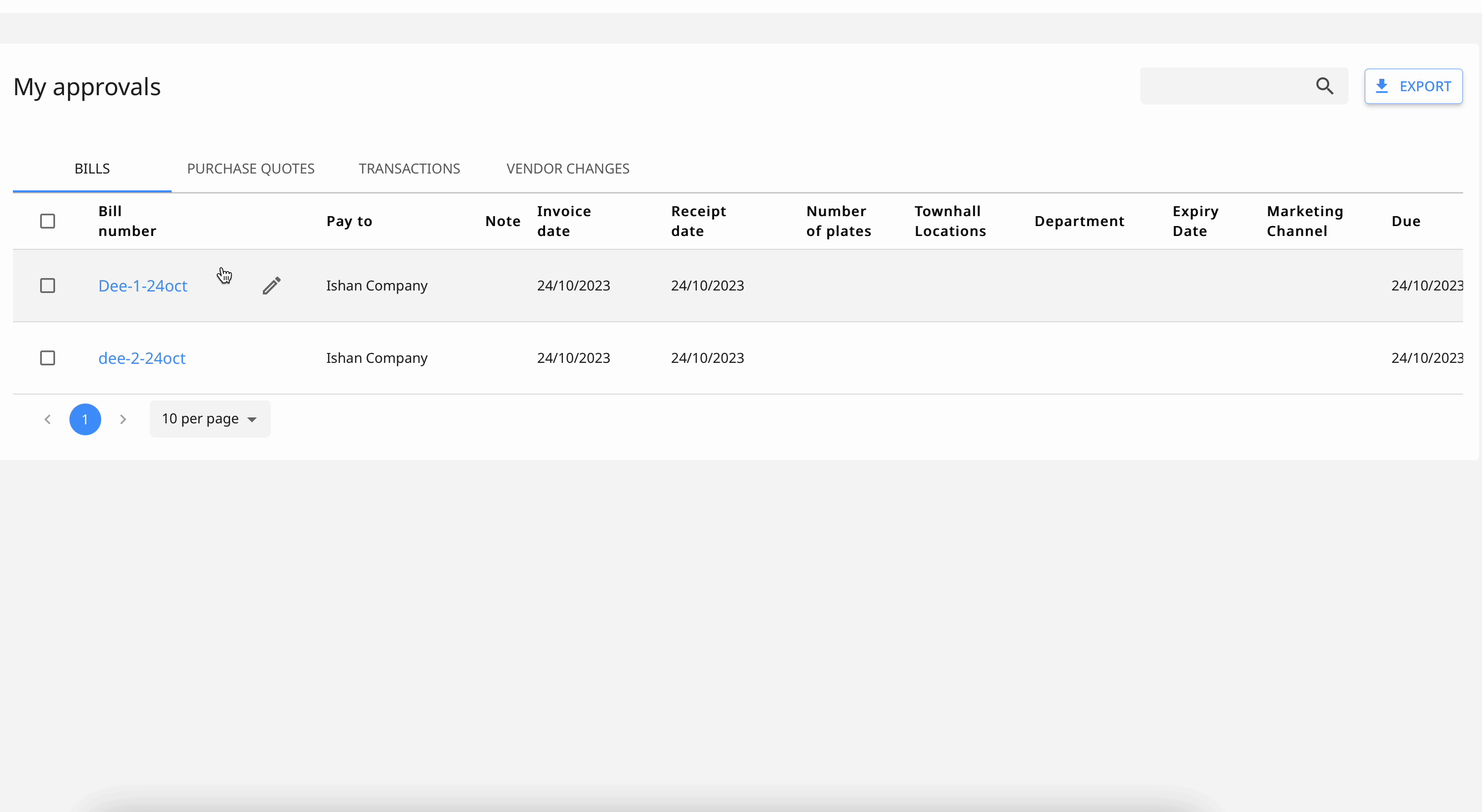 To approve, select the bills/PRs/POs/transactions and hit "Approve".