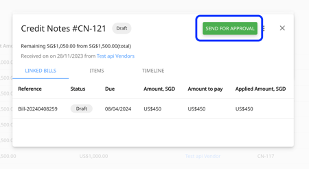 9. To send the credit note for vendor approval click on "Send For Approval".
