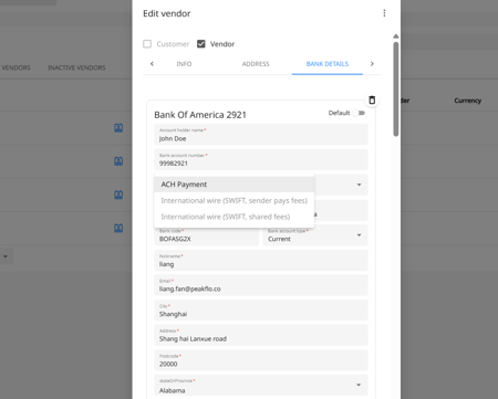 - Bank Account Routing Type: Enter the routing type used by banks for various financial transactions, with the most common being ABA and ACH, required for US domestic transfers.