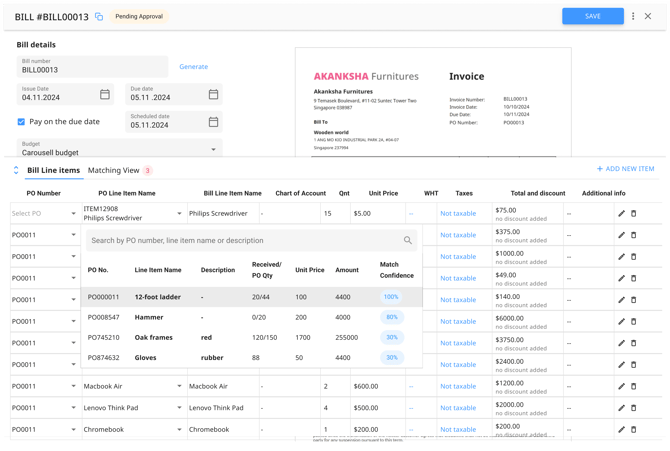 However, when the OCR bill has no PO number mentioned, then Peakflo uses Matching Confidence (a value between 0 and 100%) to confidently match the bill with the PO based on line item details such as name, description, quantity, unit price, etc.