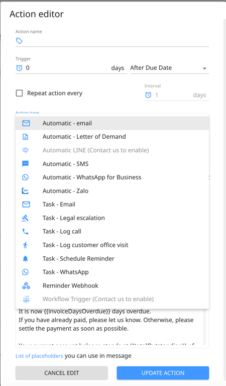- Automatic Letter of Demand — This is a paper letter sent by Peakflo on behalf of the customer as a precursor to legal action using the template defined in the workflow action editor.