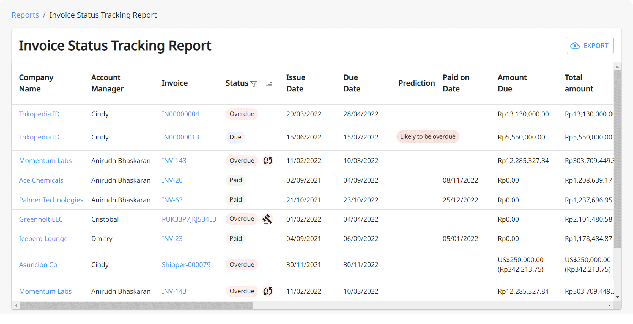 - Status: whether the invoice is paid, due, overdue, in legal escalation disputed or voided.
